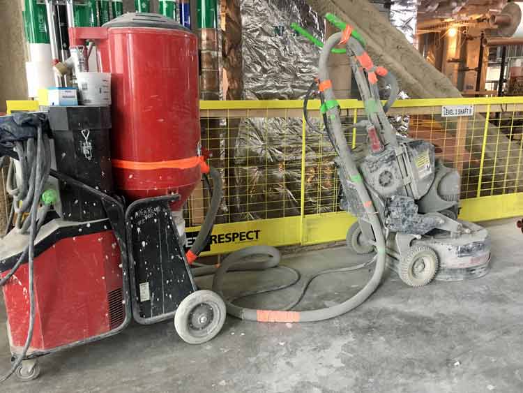 The polishing process is typically accomplished using concrete floor grinders that are outfitted with diamond abrasives. The grade of the abrasives, from coarse to fine, will determine the final smoothness of the concrete surface at the completion of the polishing process. First, concrete is stripped of any existing sealer or coatings and any visible cracks are repaired. This is followed by the polishing process using the floor grinders mentioned above. Part way through the polishing process, chemical hardeners are often added to the concrete to provide future protection against water infiltration. Finer and finer abrasives are used until the desired surface finish is achieved. If desired, the final step involves application of a sealing product to protect the concrete from oil, chemicals, staining and moisture.