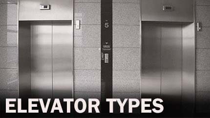Descriptions and diagrams of different elevator types: traction, MRL, and hydraulic elevators.