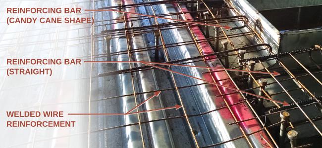 The following photo shows a complex reinforcing condition at an edge of slab. This installation is complete and ready for the concrete pour. Shown in the photo are reinforcing bars (both candy-cane shaped and straight), welded wire reinforcement, and sheer studs mounted to the steel deck.
